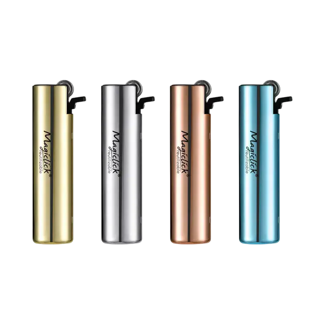 El encendedor Magiclick Eco Metálico Reutilizable combina diseño y funcionalidad en un encendedor de cuerpo cilíndrico con acabado metalizado de alta gama. Disponible en cuatro colores metálicos: dorado, plateado, cobre y celeste azul, ideal para quienes buscan un encendedor con estética premium.