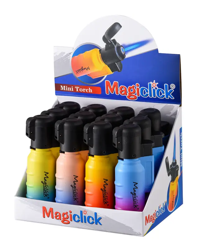 El Magiclick Mini Torch Bicolor es un encendedor tipo soplete compacto con cuerpo de plástico mate y acabado degradé bicolor en tonos vibrantes. Su diseño colorido y moderno lo convierte en una de las opciones más atractivas visualmente de la línea Mini Torch, manteniendo toda la potencia y funcionalidad del modelo metálico.