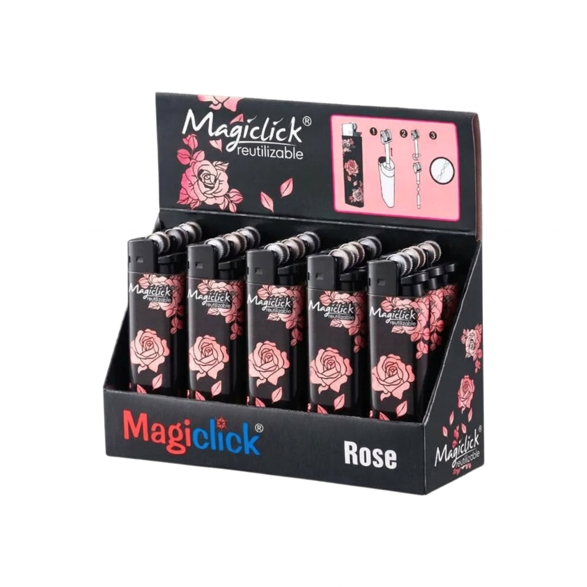 Encendedor Magiclick Reutilizable Rose reutilizable con piedra de recambio. Disponible en display de 30 unidades. Bulto de 450 unidades.