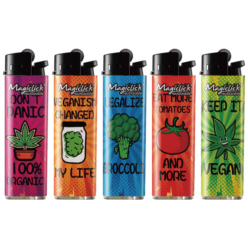 Encendedor MagiClick Reutilizable Vege, modelo a piedra tipo Clipper con diseño de vegetación que incluye motivos de plantas, hojas, flores, jardines y elementos botánicos. Sistema de encendido por piedra mecánico confiable y duradero que no depende de baterías. Completamente recargable con gas butano, permitiendo uso prolongado y reduciendo desperdicios. Diseño compacto y ergonómico perfecto para transporte. El diseño Vege con temática de vegetación lo hace atractivo para amantes de la naturaleza y coleccionistas de encendedores temáticos. Construcción en plástico resistente con impresión gráfica de alta calidad. La piedra puede reemplazarse cuando se desgaste. Tamaño estándar cómodo de manipular. Mecanismo simple y efectivo que asegura encendido consistente. Presentación en bulto de 450 unidades para distribuidores mayoristas. Display de 15 unidades con diseños variados de vegetación. Marca argentina MagiClick con más de 60 años de experiencia. Ideal para uso diario, regalo ecológico o colección botánica.