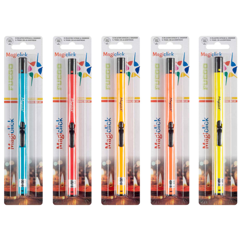 Encendedor MagiClick Fuego Premium, modelo versátil diseñado para uso doméstico y profesional. Su caño largo de 21cm proporciona alcance seguro para encender hornallas, parrillas y múltiples aplicaciones en cocina y gastronomía. Sistema electrónico piezoeléctrico recargable a gas butano con rendimiento de 1000 encendidos por carga. Característica destacada: llama regulable que permite ajustar la intensidad según la necesidad específica de cada encendido. Construcción en plástico resistente de 1.5cm de diámetro que garantiza durabilidad. Diseño ergonómico para uso cómodo y prolongado. Cumple con normas IRAM asegurando calidad y seguridad. Presentación en blister individual. Colores surtidos según disponibilidad. Ideal para uso frecuente en cocinas, parrillas y aplicaciones gastronómicas. Marca argentina MagiClick con garantía de calidad. Formato de bulto por 144 unidades ideal para distribuidores y comercios.