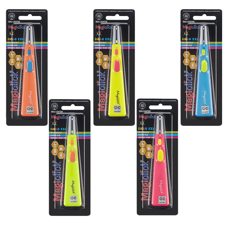 Encendedor MagiClick Siglo XXI en colores surtidos vibrantes, modelo que aporta un toque de color a tu cocina. Su innovador formato triangular permite dejarlo en posición vertical sobre su base, proporcionando estabilidad y fácil almacenamiento. Sistema electrónico piezoeléctrico recargable a gas butano con rendimiento de 1000 encendidos por carga. Dimensiones compactas de 15cm x 3cm lo hacen ideal para uso doméstico sin ocupar espacio. Cuenta con mechero corto y seguro para encendido directo. Incorpora traba de seguridad en el gatillo para prevenir activaciones accidentales. Llama fija no regulable, perfecta para encendidos rápidos y seguros en cocina. Construcción en plástico resistente con acabados en colores surtidos. Cumple con normas IRAM. Presentación en blister individual. Marca argentina MagiClick con garantía de calidad. Colores surtidos según disponibilidad.