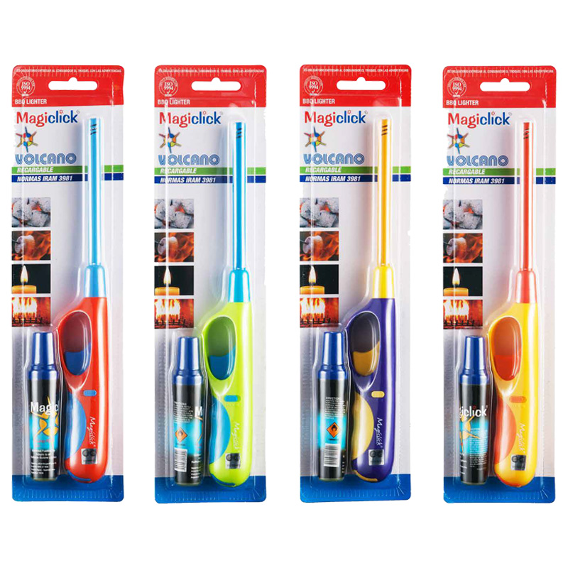 Encendedor MagiClick Volcano, el modelo profesional más completo que incluye garrafa de recarga de gas de 18cc. Sistema electrónico piezoeléctrico recargable que ofrece 1000 encendidos por carga. Su diseño extra largo de 28cm x 4cm proporciona alcance y seguridad excepcionales, ideal para encender hornallas profundas, parrillas y lugares de difícil acceso. Cuenta con traba de seguridad en el gatillo para prevenir encendidos accidentales, especialmente útil en hogares con niños. Incorpora ventana transparente para visualizar el nivel de carga de gas. Regulador de intensidad de llama para adaptar el encendido a diferentes necesidades. Construcción en metal y plástico resistente. Cumple con normas IRAM. Presentación en blister individual de 34cm x 9cm que incluye el encendedor y la garrafa de recarga. Colores surtidos según disponibilidad.